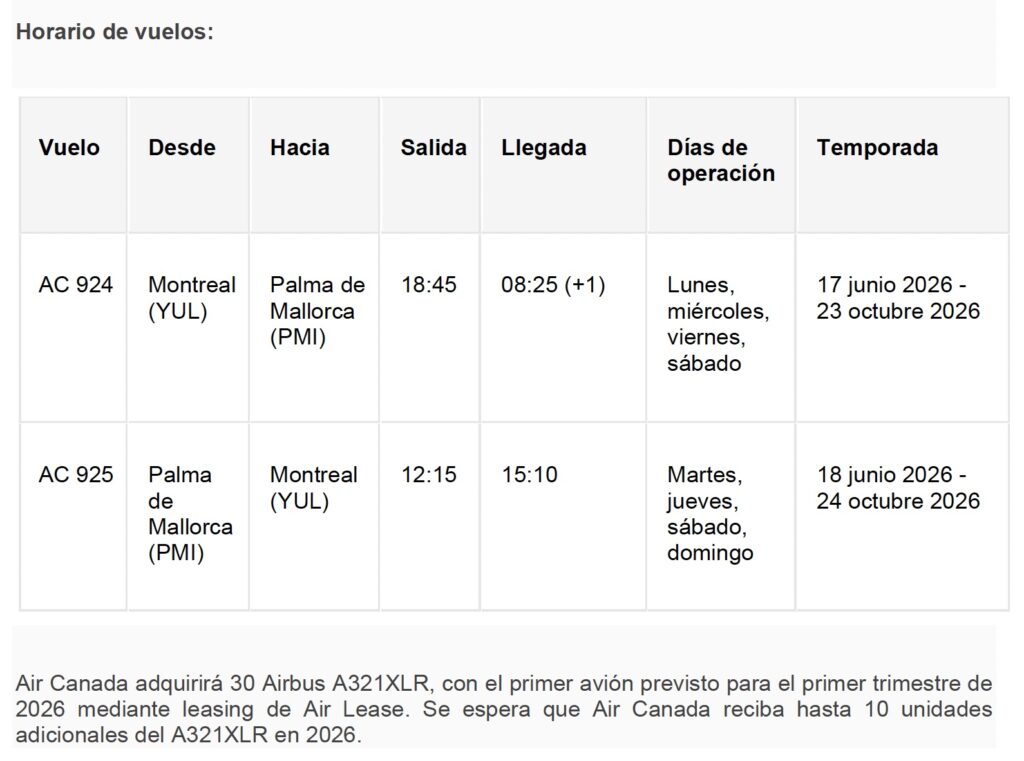 Air Canada anunció hoy la ruta Montreal – Palma de Mallorca como la primera nueva conexión que será operada por su avión Airbus A321 de alcance extralargo (XLR). La entrega de esta flota comenzará en el primer trimestre de 2026, y en junio de ese año, Air Canada inaugurará el servicio desde Montreal a Palma con este nuevo avión. Los billetes ya están disponibles en aircanada.com y a través de agencias de viajes.