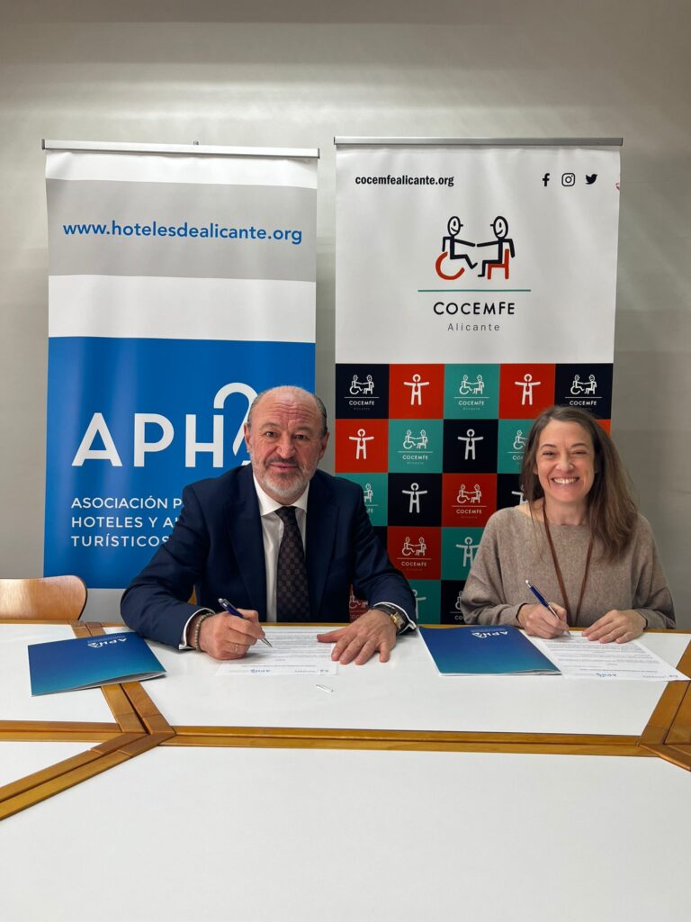 Luis Castillo ha firmado sendos convenios de colaboración con COCEMFE Alicante y la Asociación Empresarial Valenciana de Agencias de Viaje (AEVAV) para impulsar acciones conjuntas con ambas organizaciones. En el primer caso, la alianza con COCEMFE Alicante, representada por su presidenta Cristina Esclapés, tiene por objetivo promover la empleabilidad de personas con discapacidad entre las empresas integradas en APHA a través de la agencia de colocación de la organización social, así como el uso de los servicios del centro especial de empleo ACTÚA.