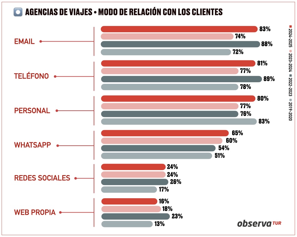 En este impulso de la tecnología en el citado lapso de tiempo, la aplicación de mensajería instantánea WhatsApp es la que más empuje adquiere como vía de comunicación agencia-cliente, según refleja el histórico de ObservaTUR. Así, el canal propiedad de Meta —que permite enviar y recibir mensajes, fotos, vídeos, notas de voz y realizar llamadas y videollamadas a través de la conexión a internet del teléfono móvil— ha incrementado su relevancia 14 puntos en la correlación agencia-cliente entre 2019/20-2024/25.