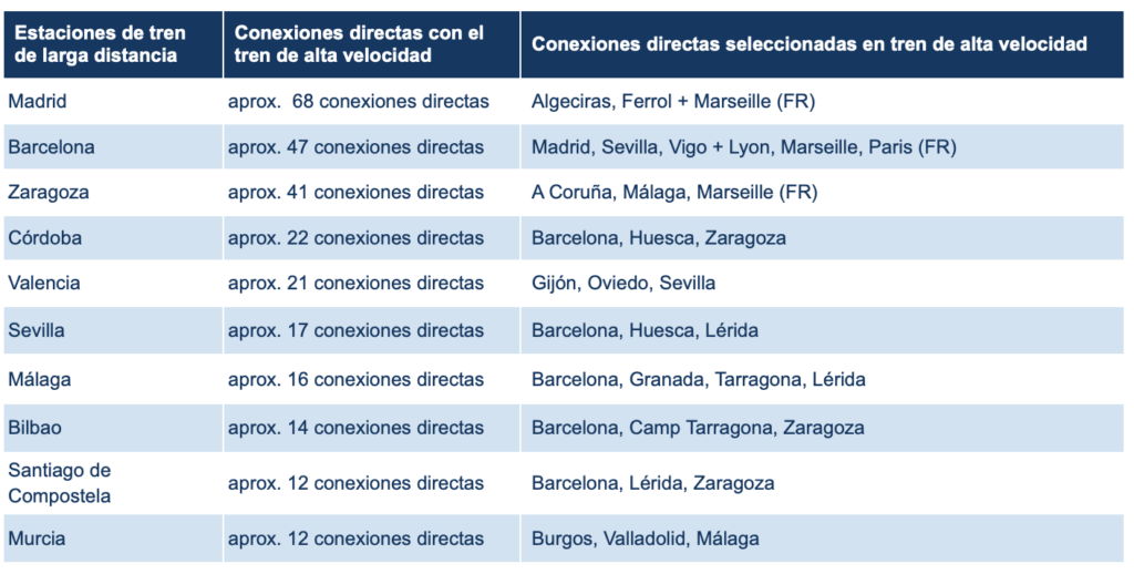 El análisis recopila todas las conexiones directas de trenes de alta velocidad (AVE) de larga distancia desde las ciudades seleccionadas. Esto muestra a los viajeros desde que estaciones cuentan con una mayor variedad de destinos y a que ciudades en el extranjero pueden dirigirse sin transbordo.