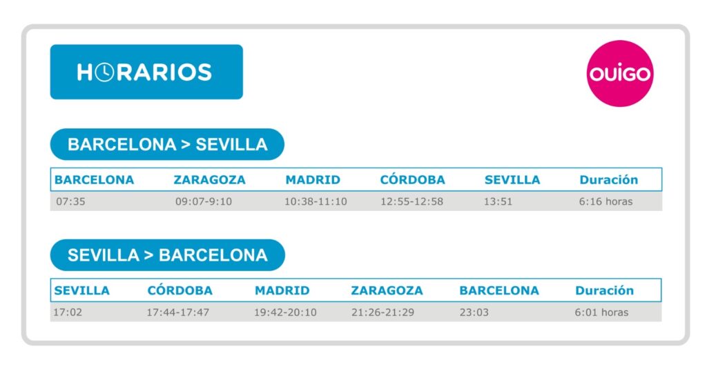- OUIGO anuncia hoy una nueva conexión entre Barcelona y Sevilla, con paradas en Zaragoza, Madrid y Córdoba, que contará con una circulación de ida y vuelta diaria a partir del 14 de diciembre