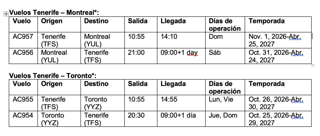 Air Canada ha anunciado nuevas rutas sin escalas desde Tenerife a Toronto y Montreal para la temporada de invierno 2026-2027, marcando el inicio del primer servicio directo entre las Islas Canarias y Norteamérica.