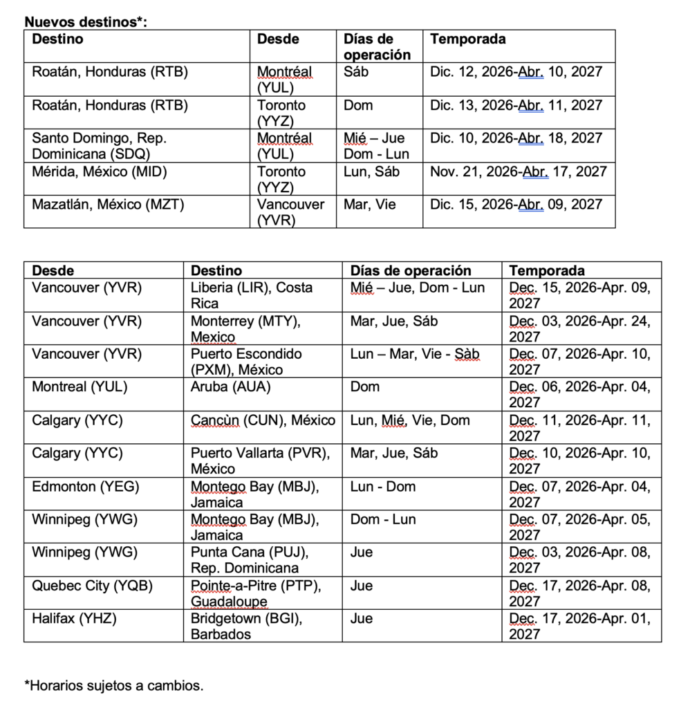 El anuncio también incluye más vuelos sin escalas desde Canadá hacia Centroamérica, el Caribe y México, incluyendo nuevos destinos de Air Canada como Roatán, Santo Domingo, Mérida y Mazatlán