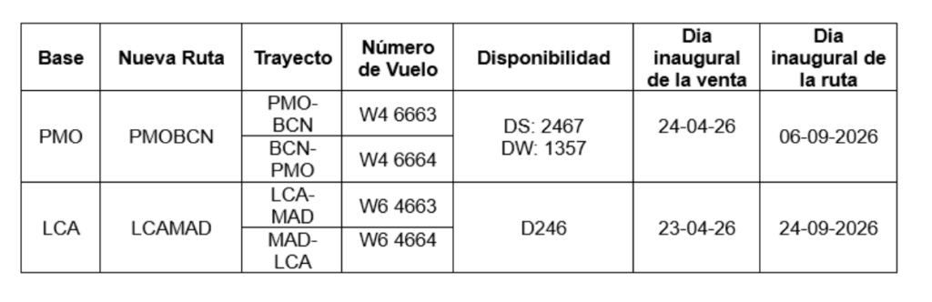 Por su parte, la ruta entre Barcelona y Palermo se inaugurará el 6 de septiembre de 2026. La ruta operará 4 veces por semana con tarifas a partir de 24,99 EUR.